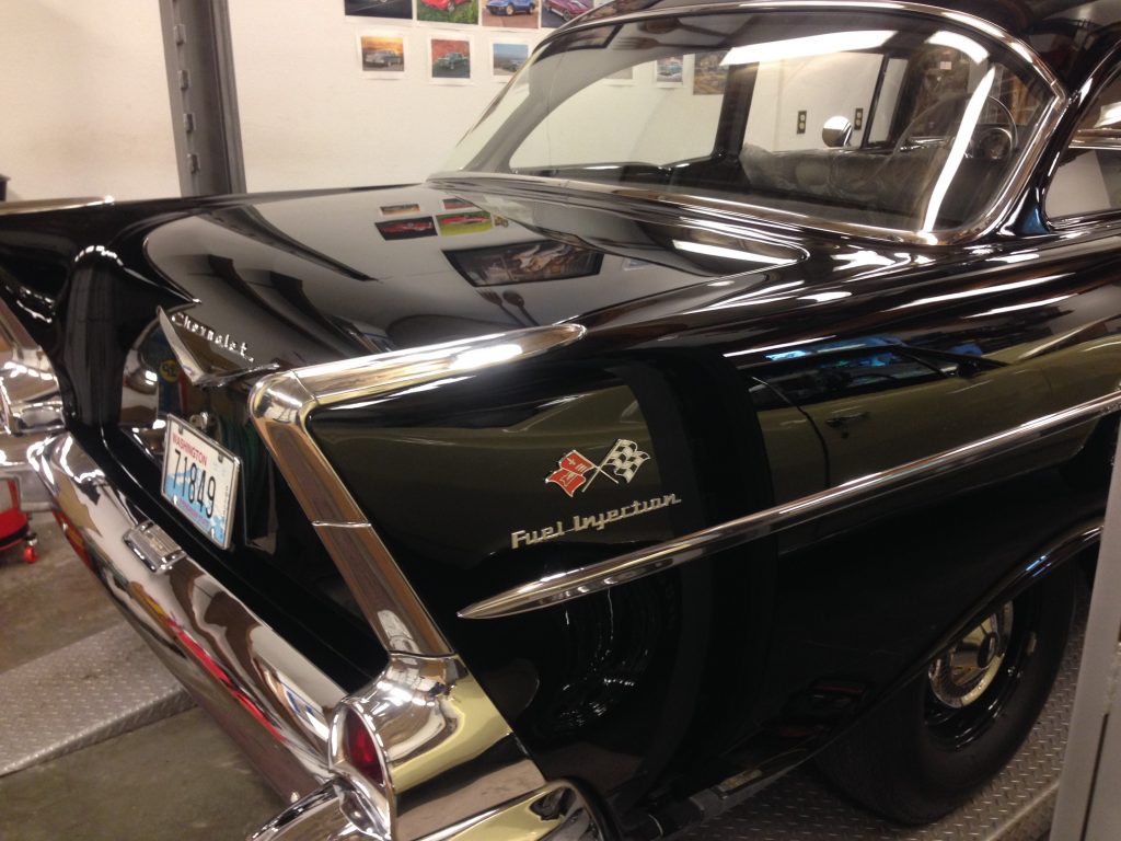 My ’57 is a 2 – door post car 150 series and black in color. It was probably a drag race car in its day as it has a 283/283 Fuel Injection system, 3 speed close ratio and many deleted items like back seat, radio, heater, clock, etc. It is all original and very well preserved.